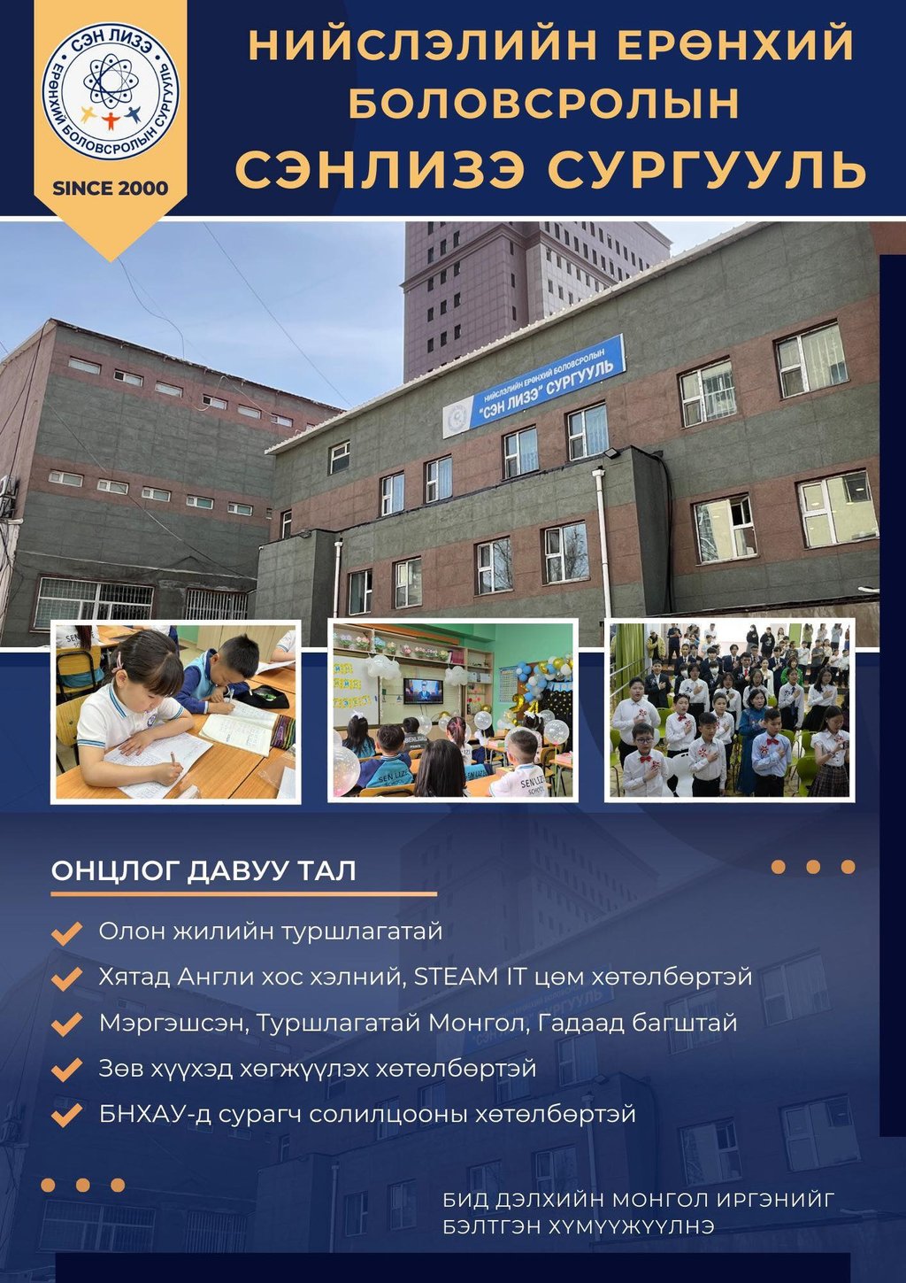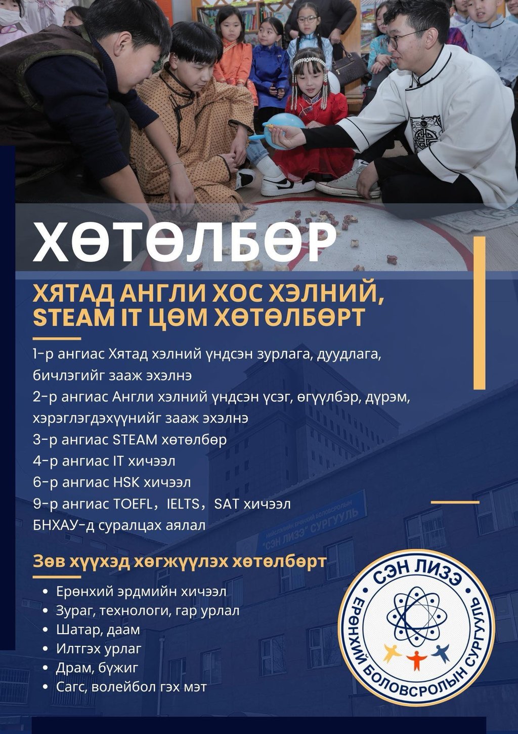 Гадаад хэлний гүнзгийрүүлсэн сургалт, ерөнхий эрдмийн хичээл, STEAM хөтөлбөр, урлаг, биеийн тамирын дугуйлан клуб.